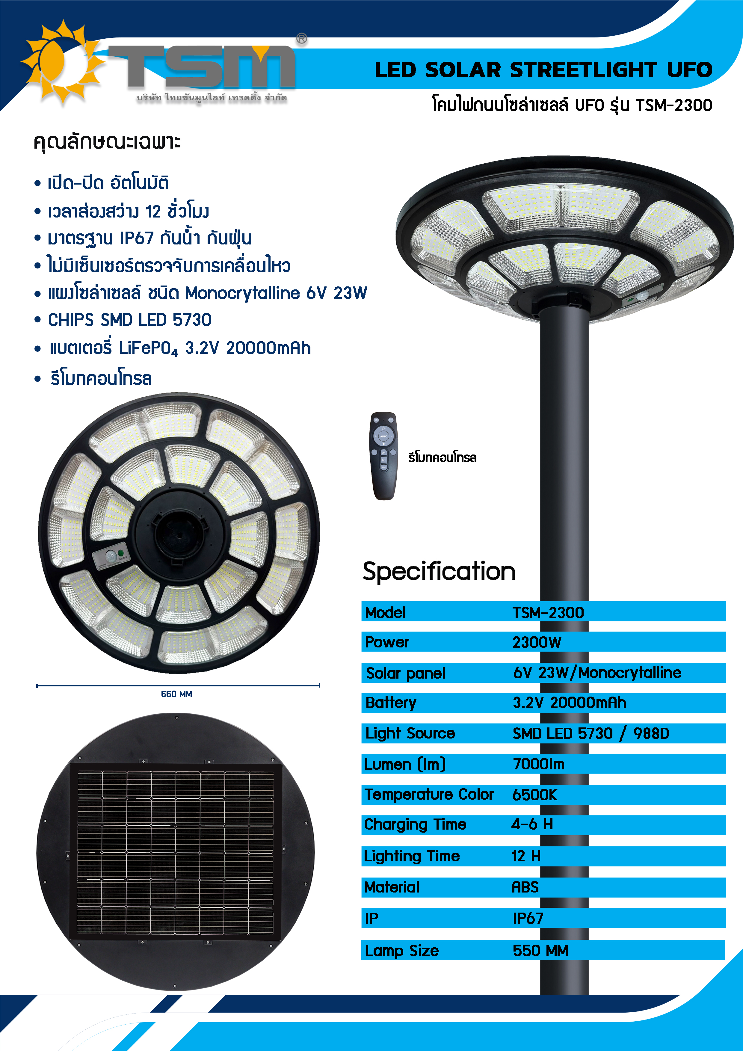 ไฟ UFO โซล่าเซลล์ 2300W แสงไฟสีขาว ไม่มีเรดาห์เซ็นเซอร์ แผงโมโนคริสตัลไลน์ **ไม่มีเสา**