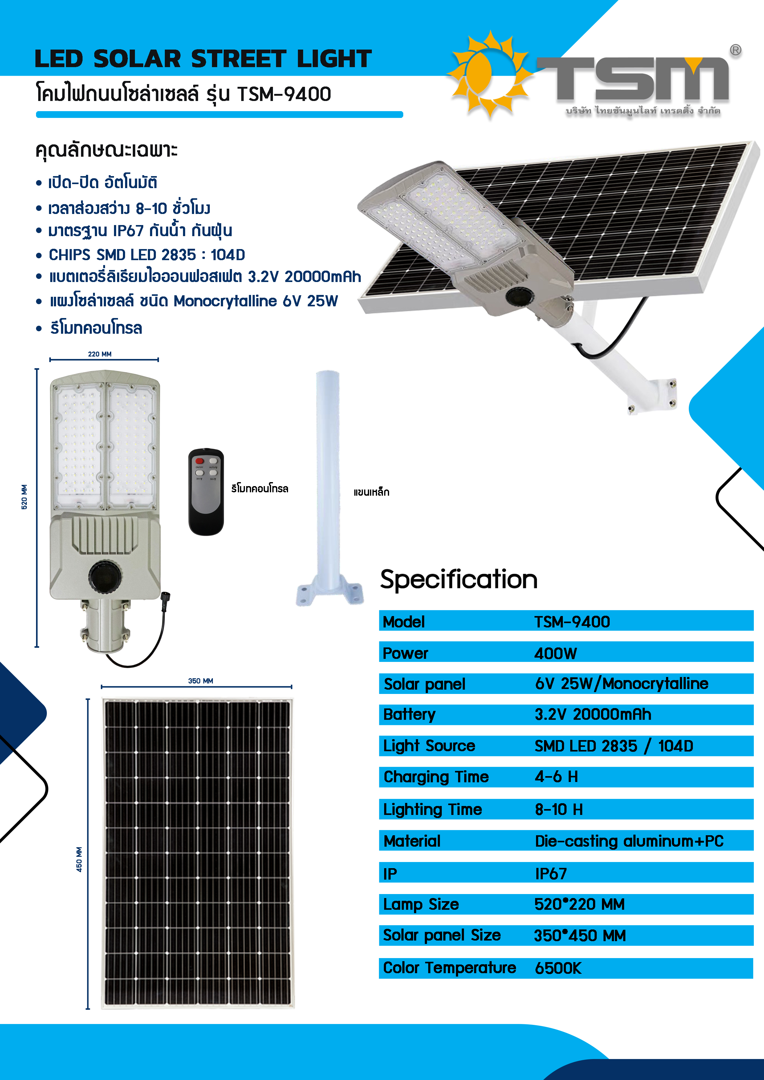 โคมไฟโซล่าเซลล์ 400W แสงขาว 6500K พร้อมรีโมทควบคุม