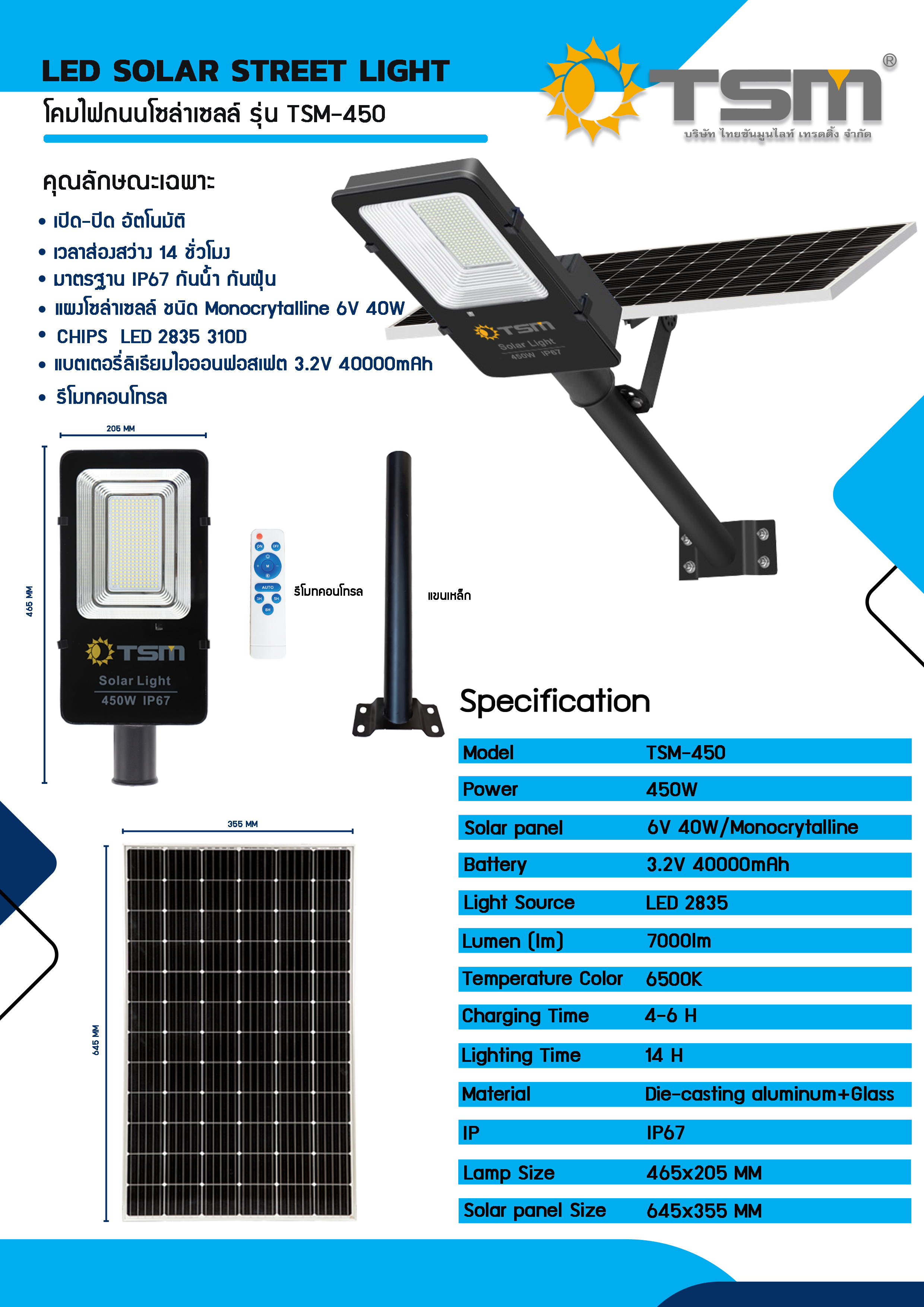 โคมไฟถนนโซล่าเซลล์ 450W แสงขาว ควบคุมด้วยรีโมท รุ่น TSM-450